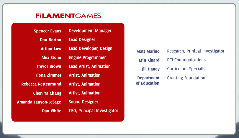 The contest web site clearly says that “Teams may be comprised of up to four members.” Project lead Dan N. of the grand prize winning team said, they were “definitely in keeping with the principle of ‘small teams development’ that the contest wanted to embody.” However, the winning game lists 13 individuals in the credits (click red image to see credits). Dan N. says their credits screen is inaccurate, and they listed their entire staff out of a sense of solidarity. He says the actual core team was: himself (lead designer), Arthur L. (lead programmer), Trevor B. (illustrator), Amanda L. (voices), and Dan W. Moreover, special education researcher Dr. Matthew M. helped plan two vital aspects of the proposal: the research theories underlying the game, and their strategy for serving the underserved communities of kids with learning disabilities. That’s six people.