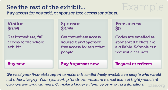 Do you know of virtual exhibits using crowd-funding strategies? Will members of the public pay a little extra to sponsor a virtual exhibit for strangers? Should sponsored payments be pure donations, or tied to a specific number of free uses?