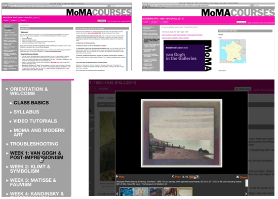 The MoMA course interface is more cluttered and dense, but they have a lot more content to cover, with many videos, text, and images for students to review in each course. The course’s web software runs on the Haiku learning system. Screenshots follow: