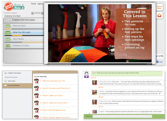 In Craftsy, there’s a clear progression of steps through the course, easy access to course materials and notes, and an active, threaded discussion. The videos are designed to be displayed on screen, as part of the course.