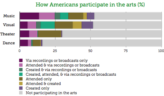 Computers and the internet are an increasingly important way that Americans engage in the arts, says a new report from the National Endowment for the Arts. The first bar in the chart below is people consuming recorded or broadcast content: