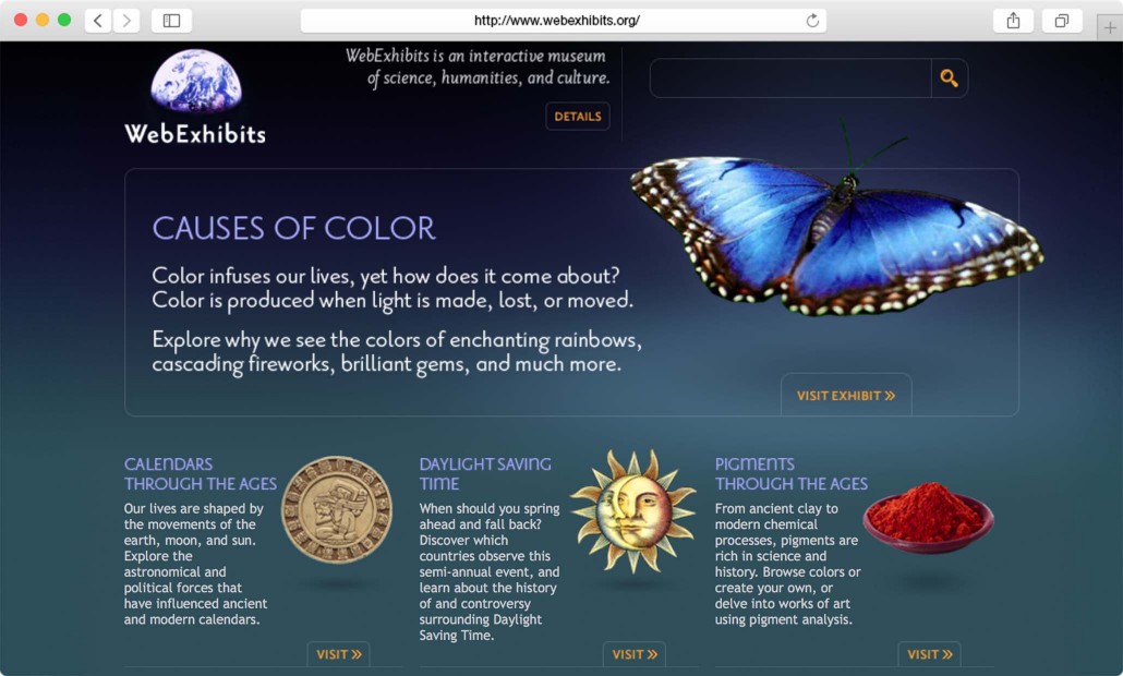 WebExhibits tapped into experts’ knowledge and early 21st century technological potential to create a rich, immersive experience that incorporates narratives, descriptions, maps, photos, video, and audio. This information, along with interactive virtual experiments and hands-on activities, prompts visitors to think, to formulate questions, and to explore topics from a variety of angles.